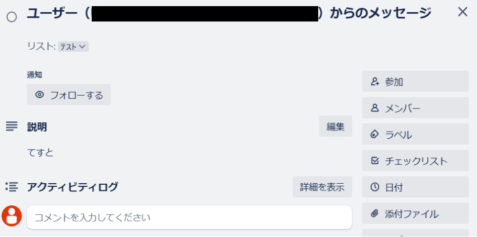 最後に、実際にTrelloにテスト送信されているか確認してみましょう。