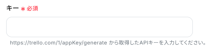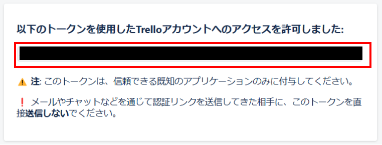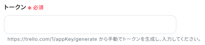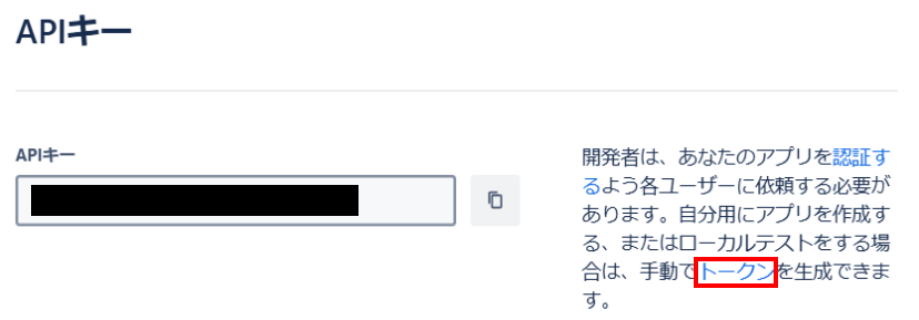 - トークン:先ほど確認したTrelloのAPIキー画面で、赤枠の「トークン」をクリックします。