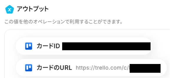テスト成功となったら下記画像のように、先ほど設定したTrelloの情報が反映されたアウトプットが表示されます。