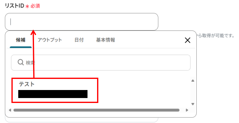 - リストID:入力欄をクリックすると下記画像のように候補が表示されます。先ほど作成したTrelloのリストを選択してください。