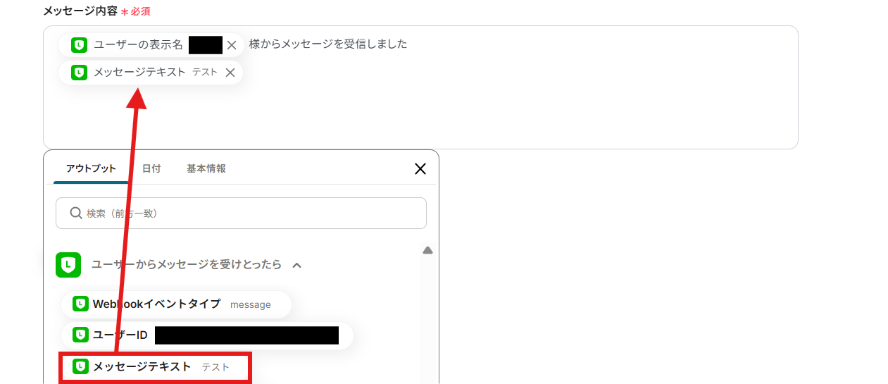 メッセージ内容:編集欄をクリックすると以下の画像のようにアウトプットが表示されます。アウトプットを活用しながら編集していきましょう。