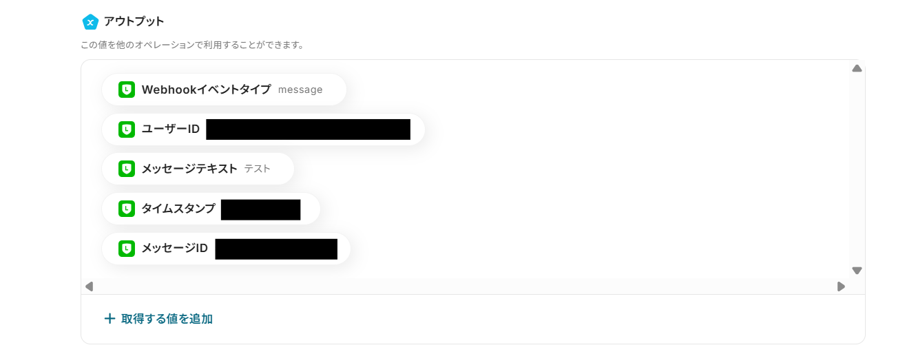 テストが成功すると以下のような「テスト成功」の画像が表示され、LINE公式アカウントから取得した情報をアウトプットとして引用できるようになります。