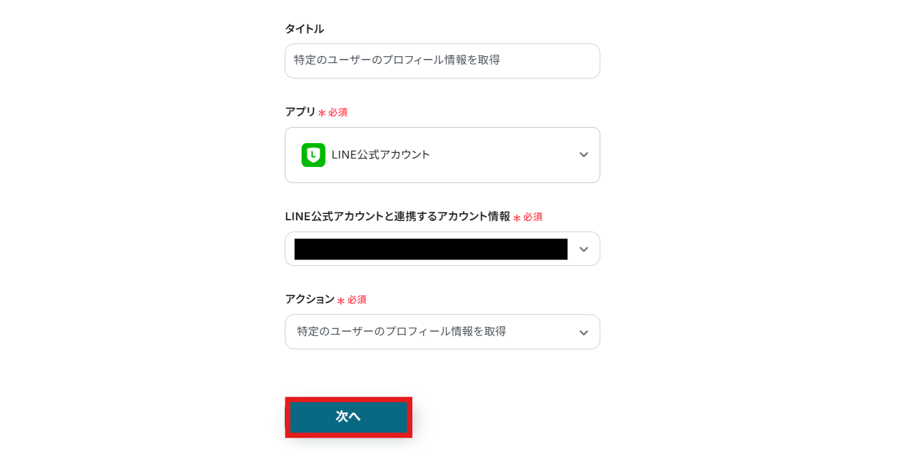アクションは「特定のユーザーのプロフィール情報を取得」を選択します。
