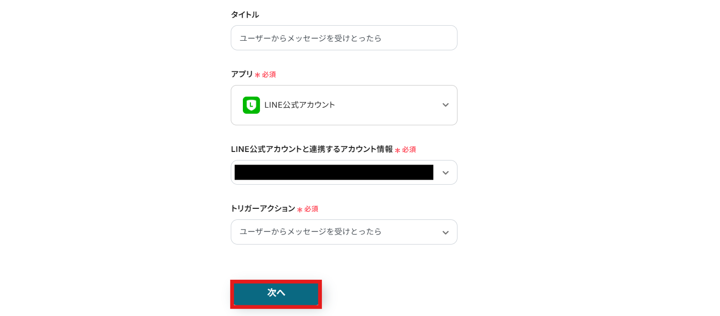 トリガーは「ユーザーからメッセージを受けとったら」を選択します。設定が終わったら「次へ」をクリックします。