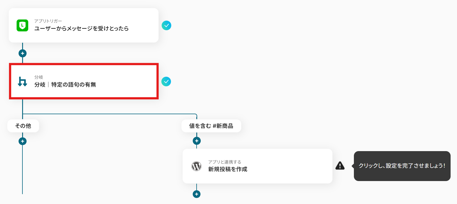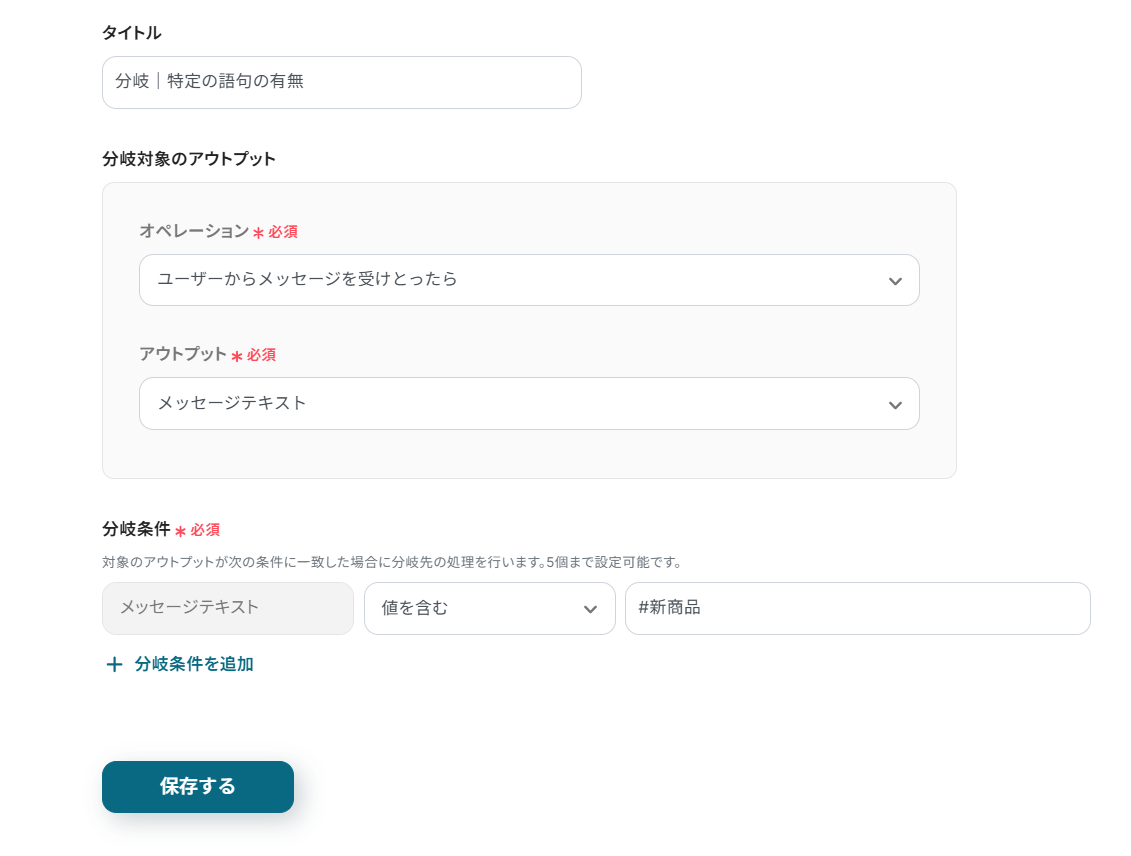 デフォルトでは分岐に「#新商品」が含まれていると分岐する設定となっています。