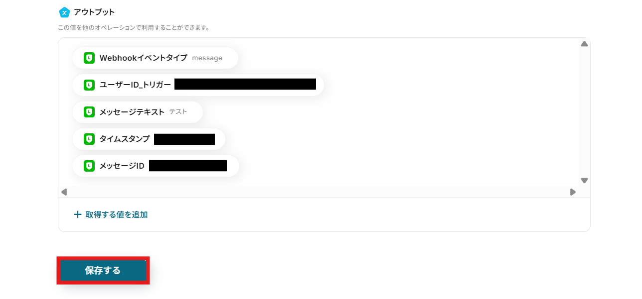 テストが成功すると以下のような「テスト成功」の画像が表示され、LINE公式アカウントから取得した情報をアウトプットとして引用できるようになります。