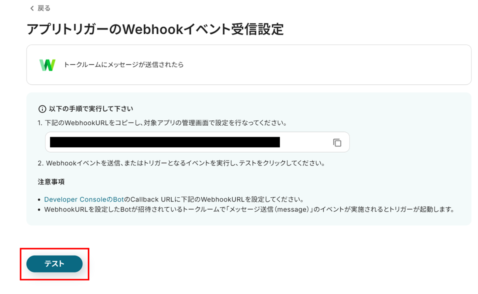 (3)「アプリトリガーのWebhookイベント受信設定」画面から、WebhookURLをコピーし、LINE WORKSの管理画面で設定を行います。