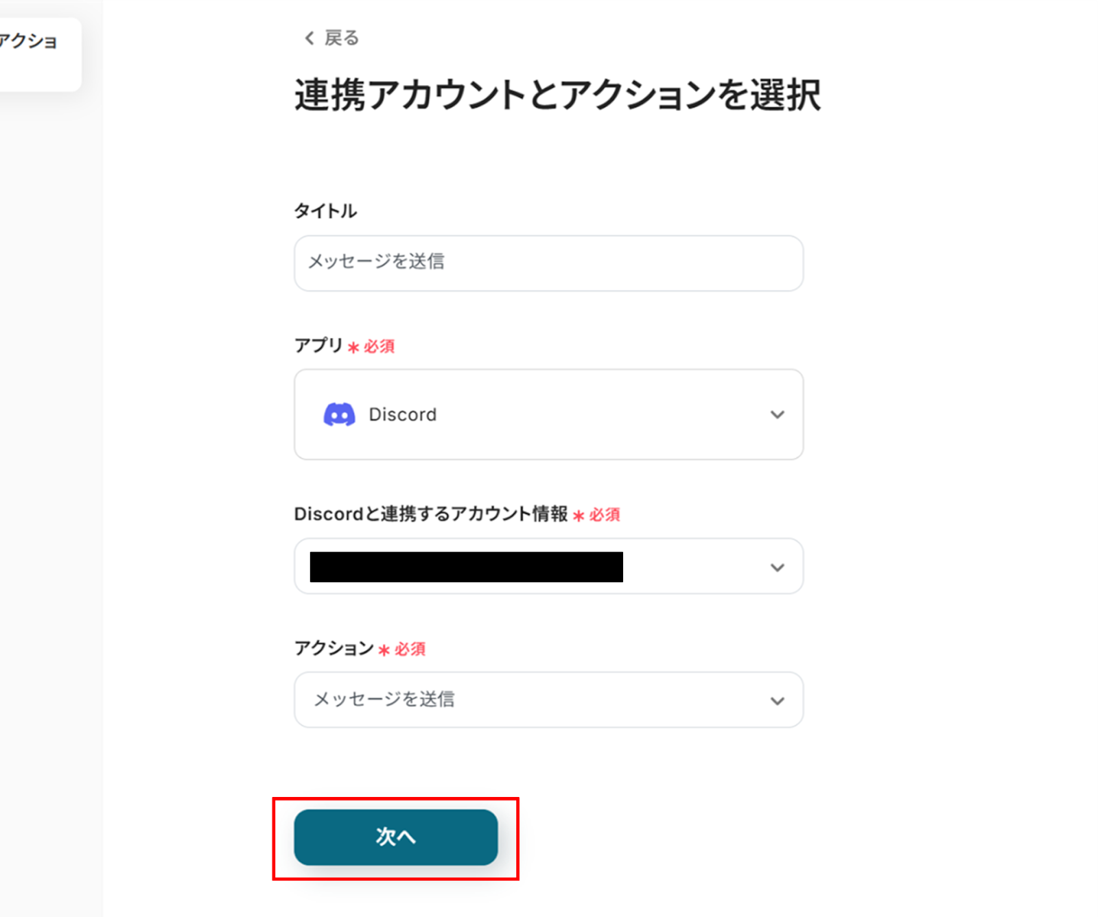 (2)Discordの「連携アカウントとアクションを選択」画面から、Discordと連携するアカウント情報に誤りがないかを確認し、アクションは「メッセージを送信」のままで「次へ」をクリックします。