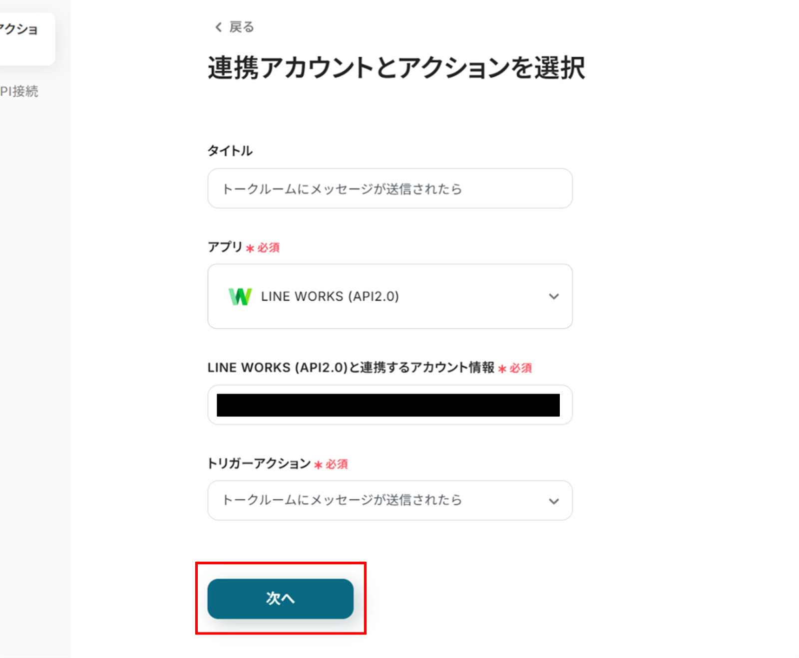 (2)LINE WORKSの「連携アカウントとアクションを選択」画面から、LINE WORKSと連携するアカウント情報に誤りがないかを確認し、トリガーアクションは「トークルームにメッセージが送信されたら」のままで「次へ」をクリックします。