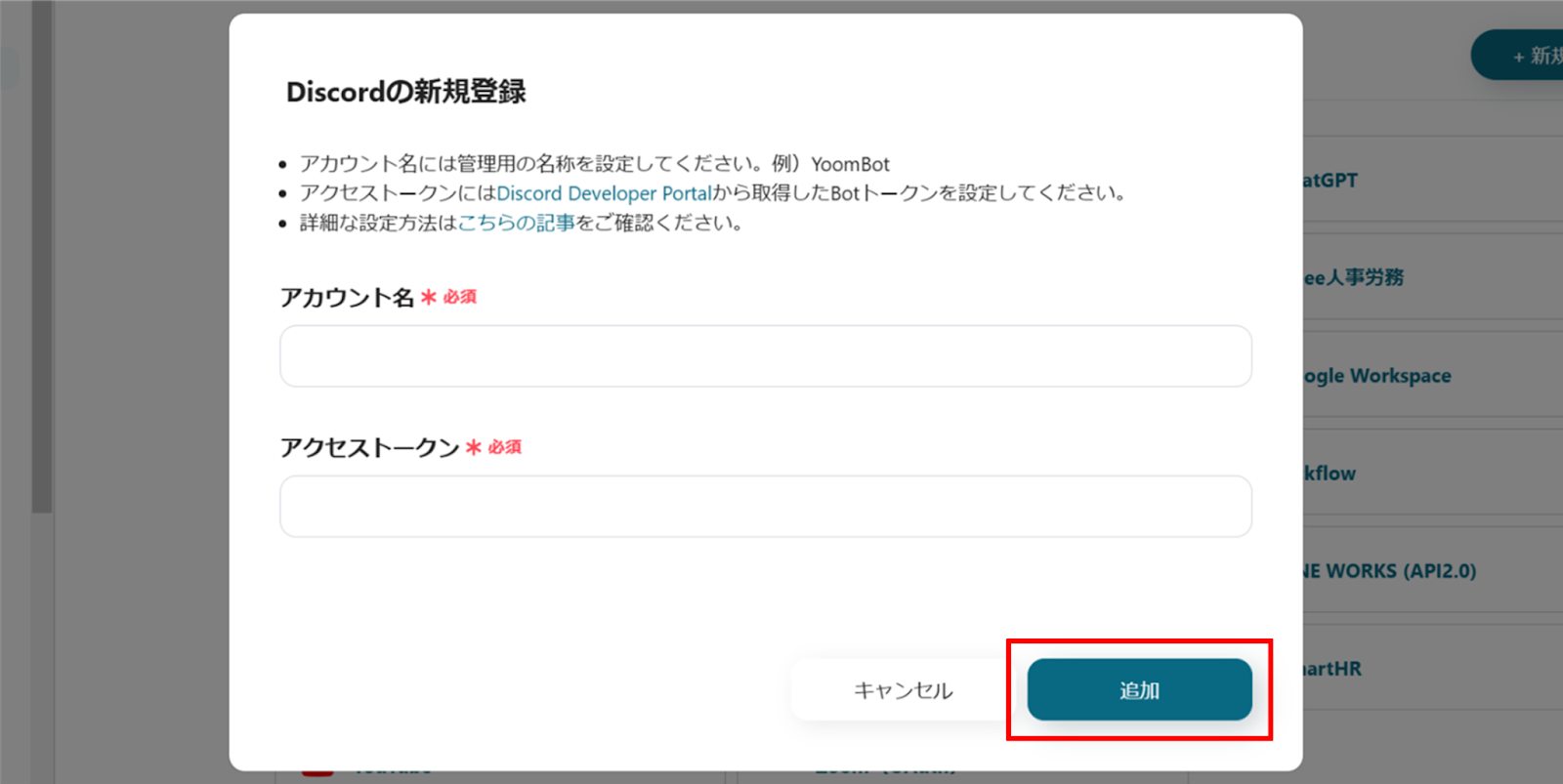 「Discordの新規登録」画面から、アカウント名、アクセストークンを入力し、「追加」を押します。