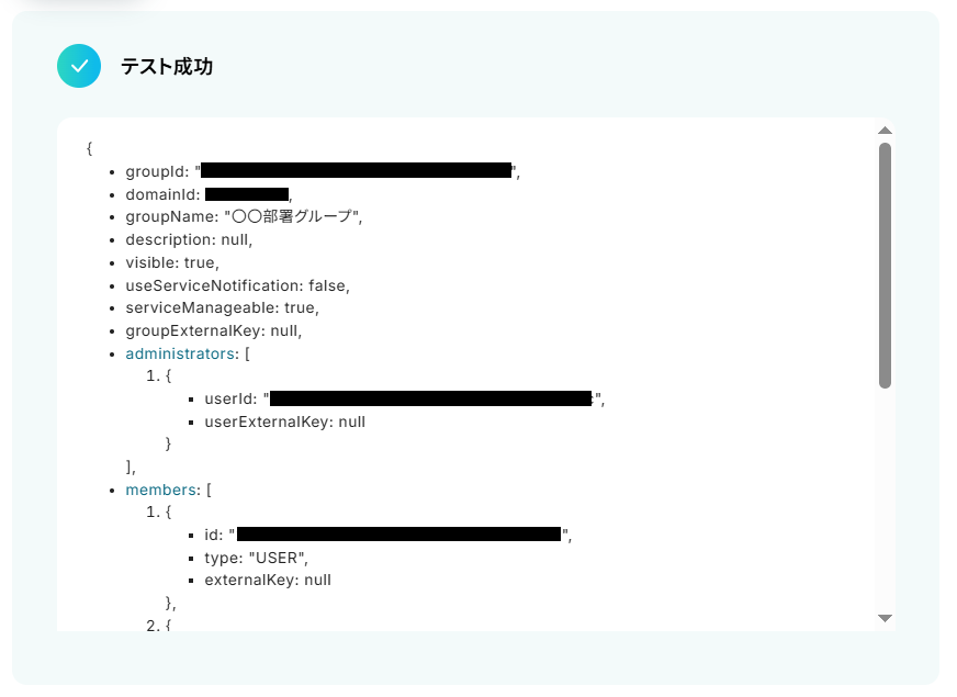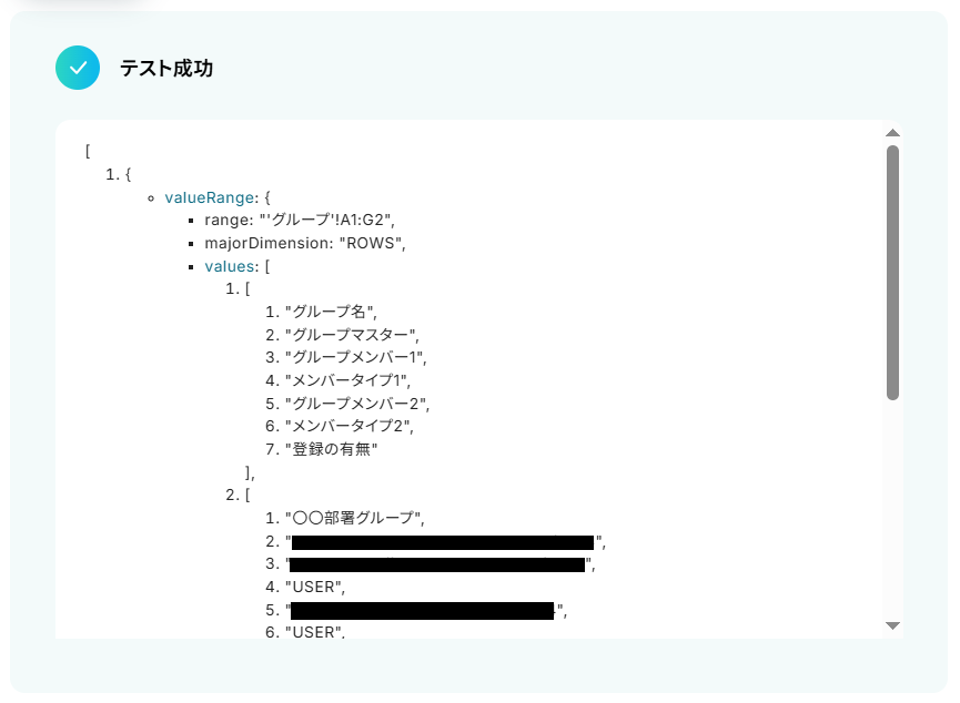 テストに成功するとテスト成功画面が表示され、取得した値が表示されます。 取得した値は実行した結果が設定される動的な値として利用できるため、このあとの設定でも使用します。 詳しく知りたい方は以下のリンク先をご覧ください。