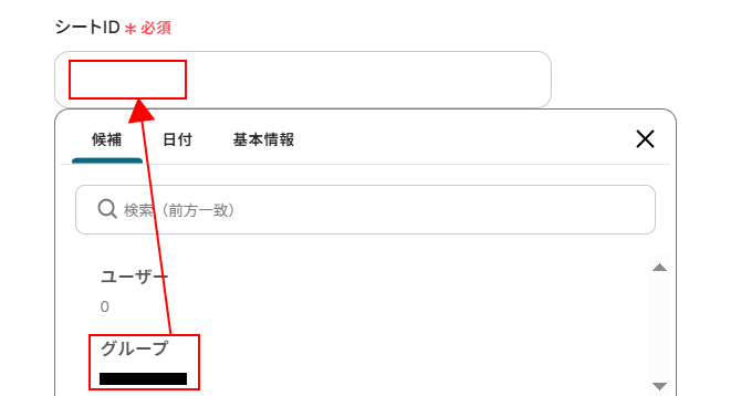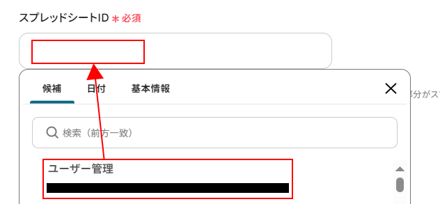 シートIDを設定します。 入力欄をクリックし、表示された候補の中から使用しているシートを選択します。