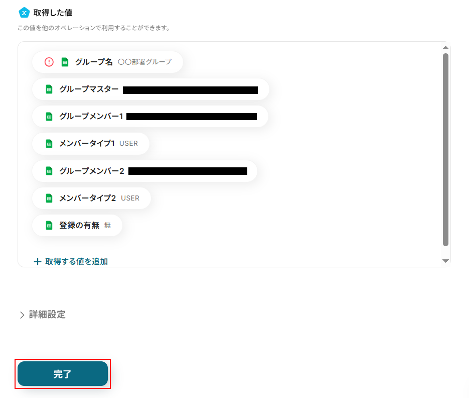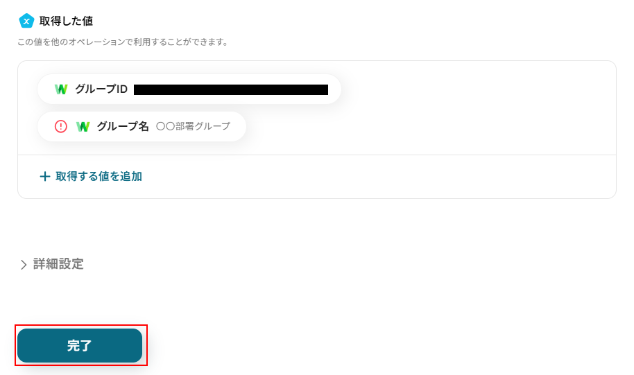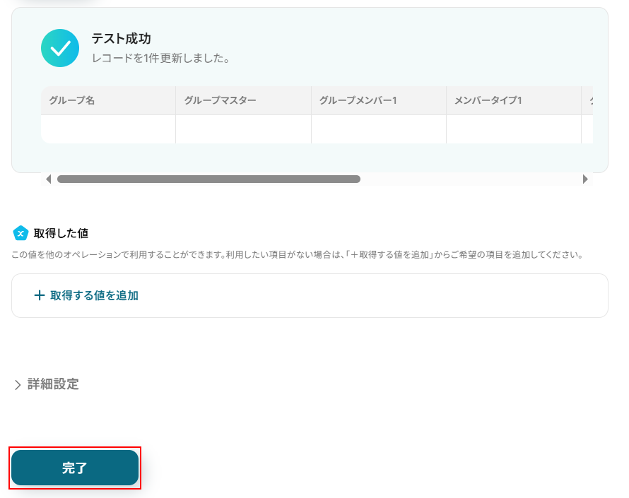 テストに成功するとテスト成功画面と取得した値が表示されますのでご確認ください。 確認できたら完了 をクリックしましょう。