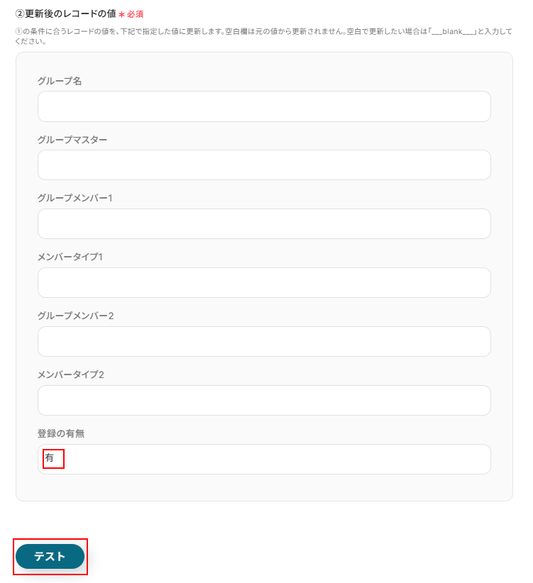 次に、更新後のレコードの値を設定します。 ご自身の状況に合わせて設定を行ってください。 今回は登録の有無の項目を無から有に更新するため、以下のように設定しました。 ここまで設定できたらテストをクリックしましょう。 ※テストをクリックすると、実際にレコードが更新されます。