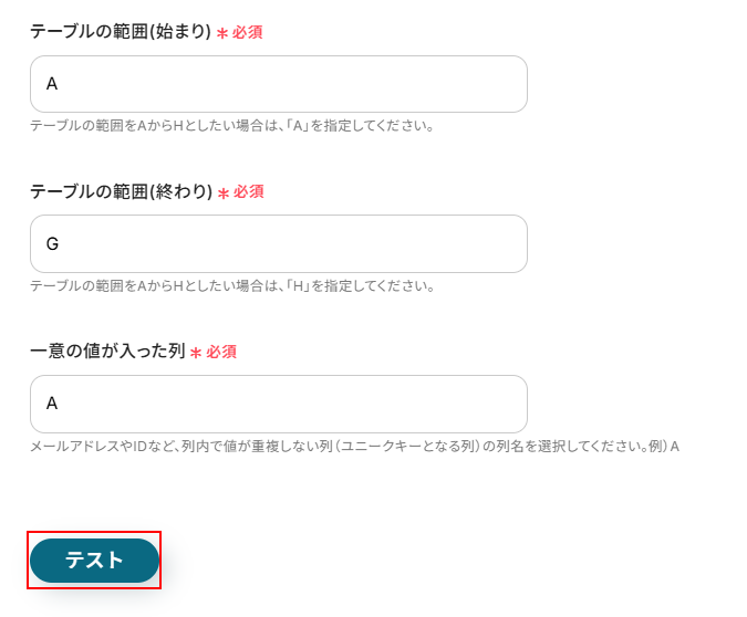 テーブルの範囲(始まり)、テーブルの範囲(終わり)、一意の値が入った列を設定します。 用意したスプレッドシートを確認し、それぞれ入力してください。 ここまで設定できたらテストをクリックしましょう。