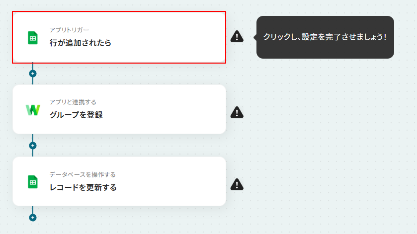 行が追加されたら をクリックします。 Googleスプレッドシートをアプリトリガーとして使用する際の注意事項は「【アプリトリガー】Googleスプレッドシートのトリガーにおける注意事項 」を参照してください。