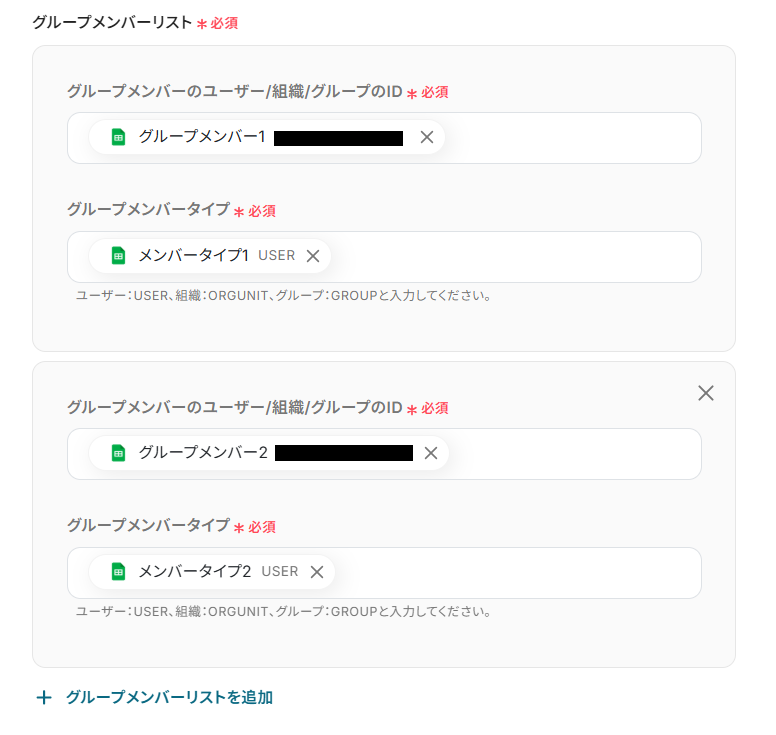 グループメンバーリストを設定します。 こちらも同様に取得した値から設定しましょう。 また、メンバーを追加したい場合は+グループメンバーリストを追加 をクリックしてください。