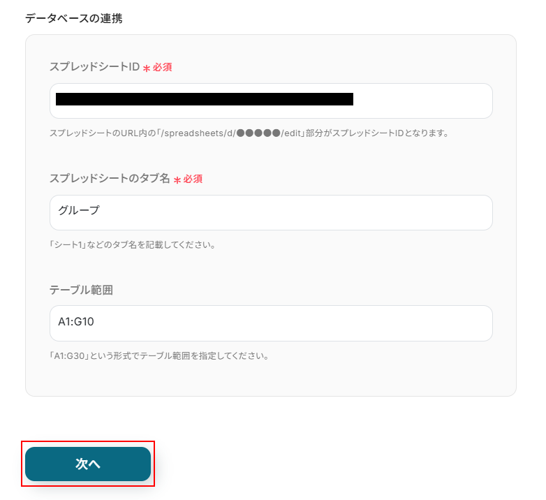 スプレッドシートID、スプレッドシートのタブ名はステップ3と同じものを設定します。