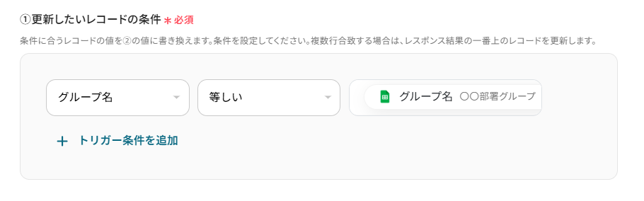 更新したいレコードの条件を設定します。 左端の項目にはGoogle スプレッドシートに設定している項目名が表示されます。 それぞれ更新したい条件に合わせて選択してください。 今回は先ほどグループを登録したレコードに対して更新を行いたいため、以下のように設定しました。