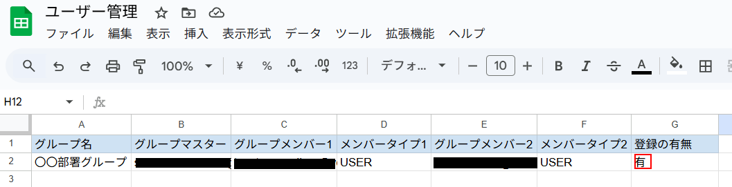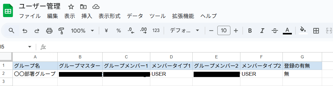 Google スプレッドシートを用意する 今回ご紹介するテンプレートはGoogle スプレッドシートの情報からLINE WORKSのグループを登録します。 そのため、実際にテストを行うにはGoogle スプレッドシートにグループの情報を入力しておく必要があります。 今回は以下のように設定しました。 ※グループ名、グループマスター、グループメンバー、メンバータイプは必須項目です。 また、今回グループマスター、グループメンバー、にはLINE WORKSに登録する際に作成したメールアドレスを設定しています。 また、メンバータイプにはユーザー:USER、組織:ORGUNIT、グループ:GROUPのいずれかを設定しています。
