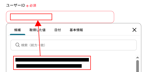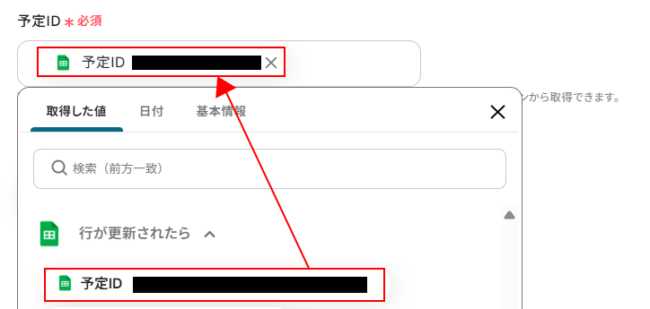 予定IDはデフォルトで取得した値が設定されています。 取得した値を活用することで、固定値ではなく、トリガーが実行されるたびに最新の情報が反映できます。 項目名は表示されていても値が表示されていない場合は、 入力欄をクリックし 取得した値から選択してください。