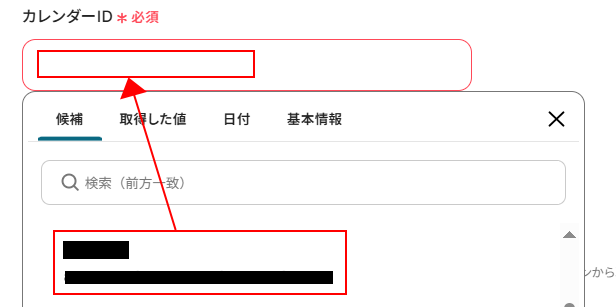 カレンダーIDを設定します。 入力欄をクリックし、表示された候補の中から連携したいカレンダーを選択します。