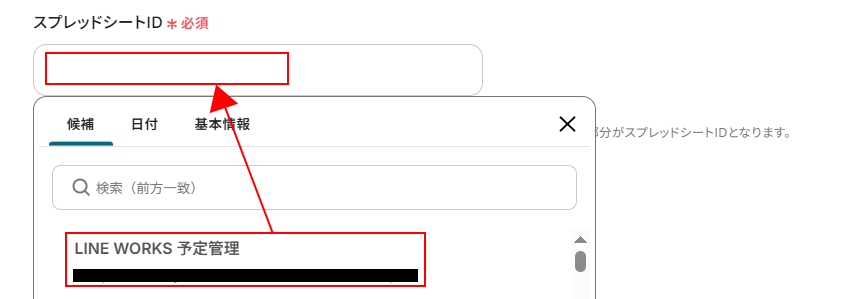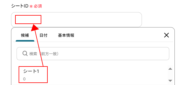 シートIDを設定します。 先ほどと同様に入力欄をクリックし、表示された候補の中から使用しているシートを選択します。