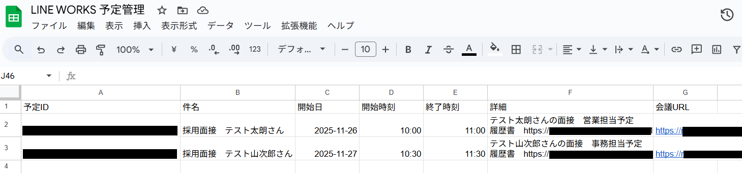 2 作成した予定の情報をGoogle スプレッドシートに記載する 先ほど作成した予定をGoogle スプレッドシートに記載しましょう。 今回は以下のように作成しました。 A列に記載している予定IDを一意の値として使用しています。 ※予定IDはLINE WORKSのカレンダーの該当予定のURLから取得できます。 https://calendar.worksmobile.com/web/calendar/scheduleView?action=view&calendarId=カレンダーID&scheduleId=予定ID &‥‥ %40は@に変換してください。