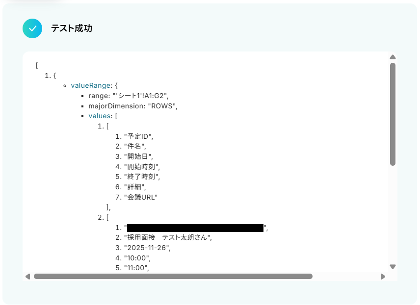 テストに成功するとテスト成功画面が表示され、取得した値が表示されます。 取得した値は実行した結果が設定される動的な値として利用できるため、このあとの設定でも使用します。 詳しく知りたい方は以下のリンク先をご覧ください。