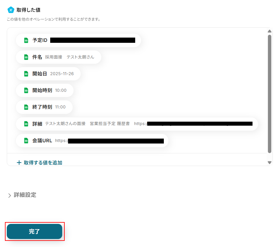 テストに成功するとテスト成功画面と取得した値が表示されますのでご確認ください。 確認できたら完了 をクリックしましょう。 ※テスト成功画面にnullと表示されますが、問題ありません。