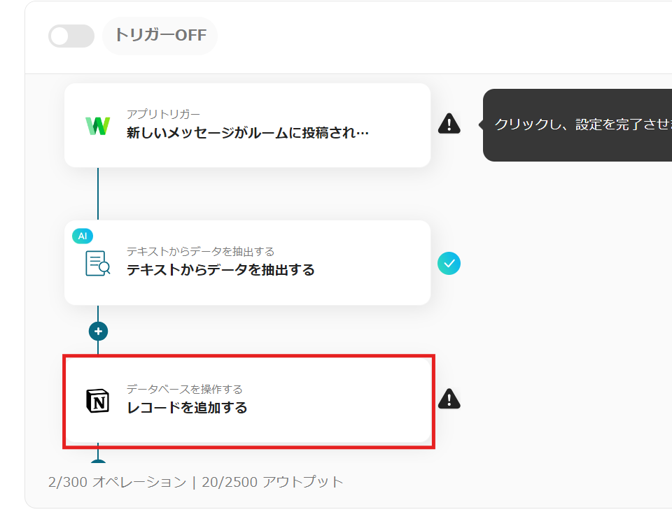 12)これで【LINE WORKSで特定のルームに投稿した内容をNotionのデータベースに追加する】というフローの完成です。