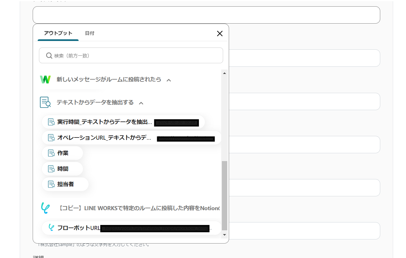 LINE WORKSで特定のルームに投稿した内容をNotionのデータベースに追加するフローです。