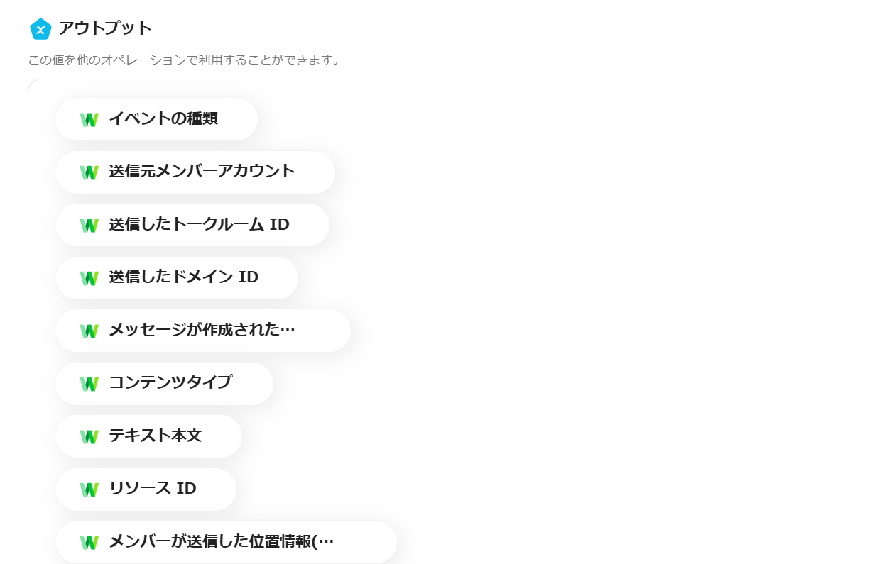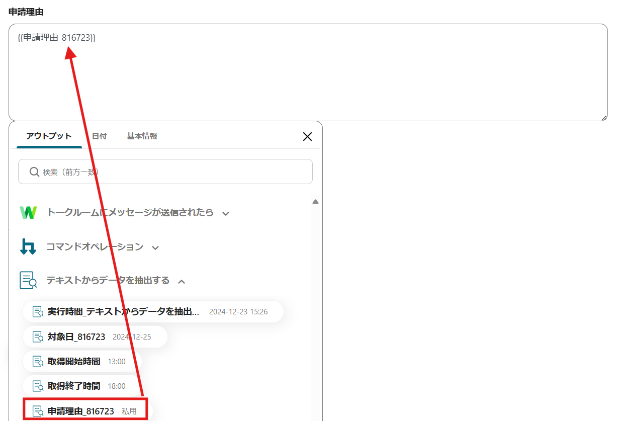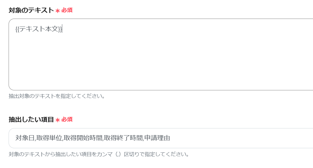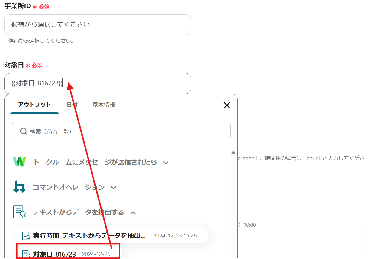 必須項目をアウトプット(取得した値)から選択していきます。