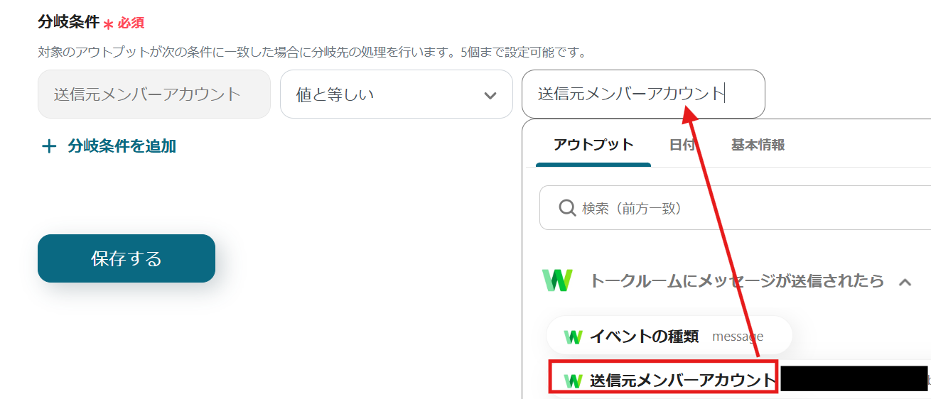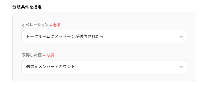 分岐条件には、有給申請を行う従業員の送信元メンバーアカウントを設定してください。