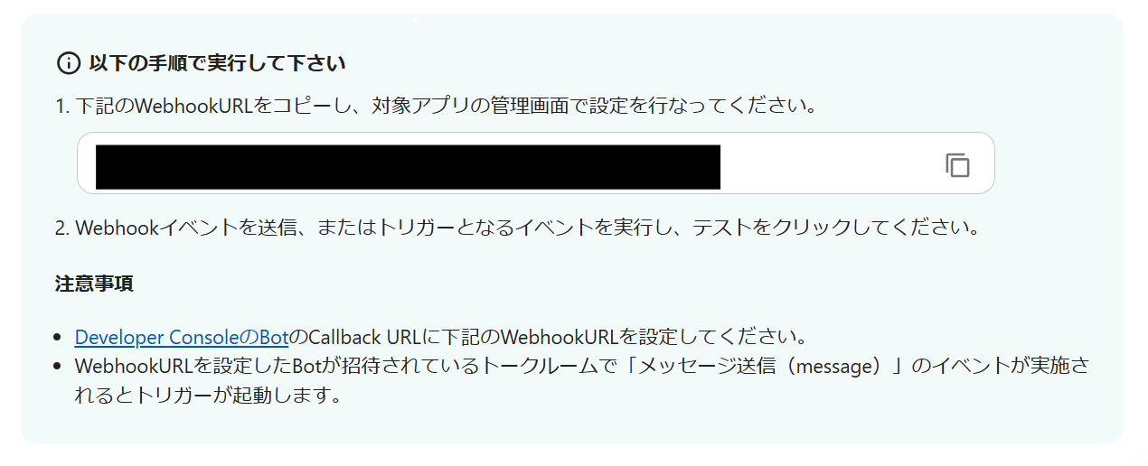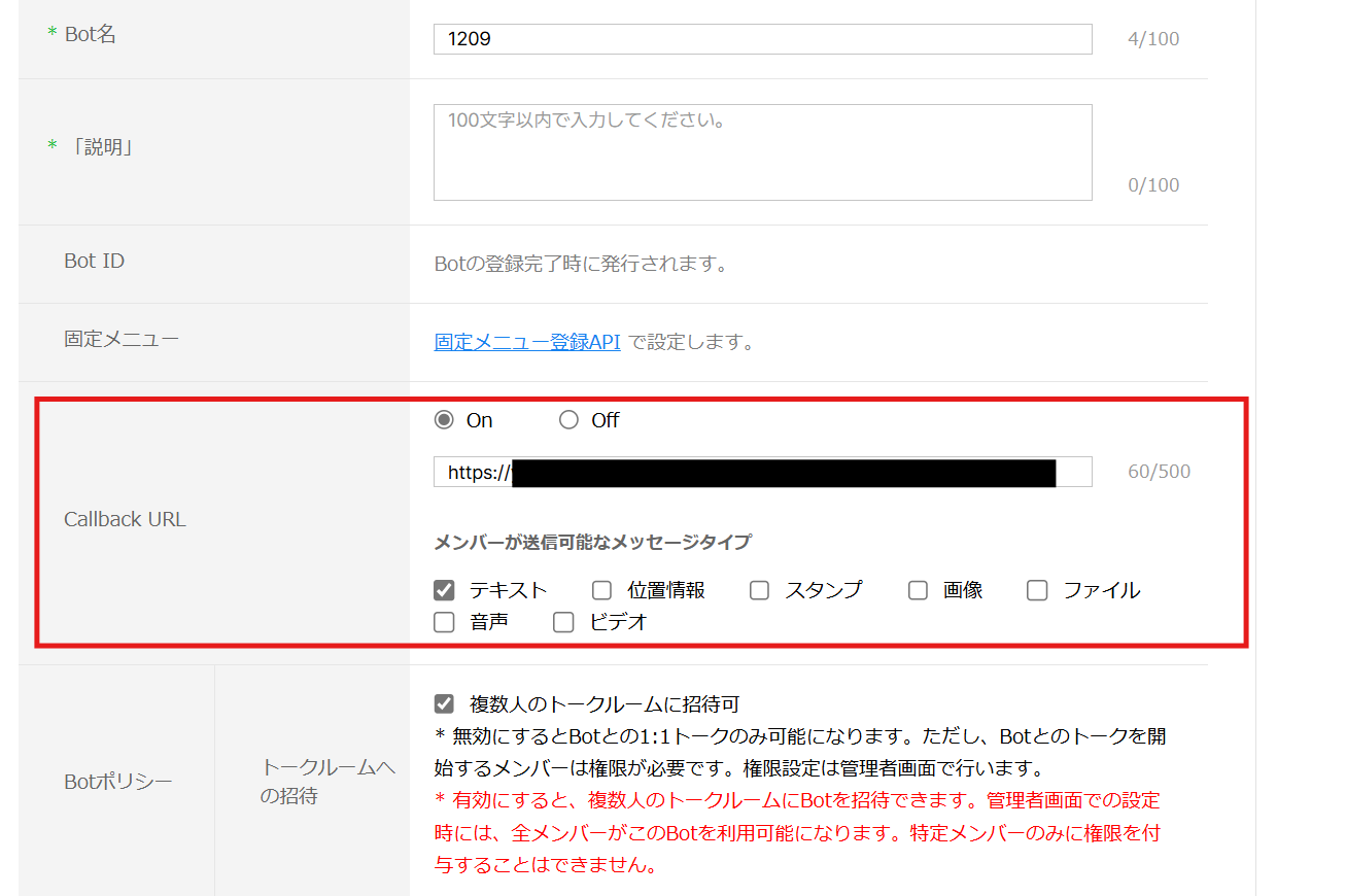 上記のWebhookURLを、LINE WORKSのCallback URLに追加してください。