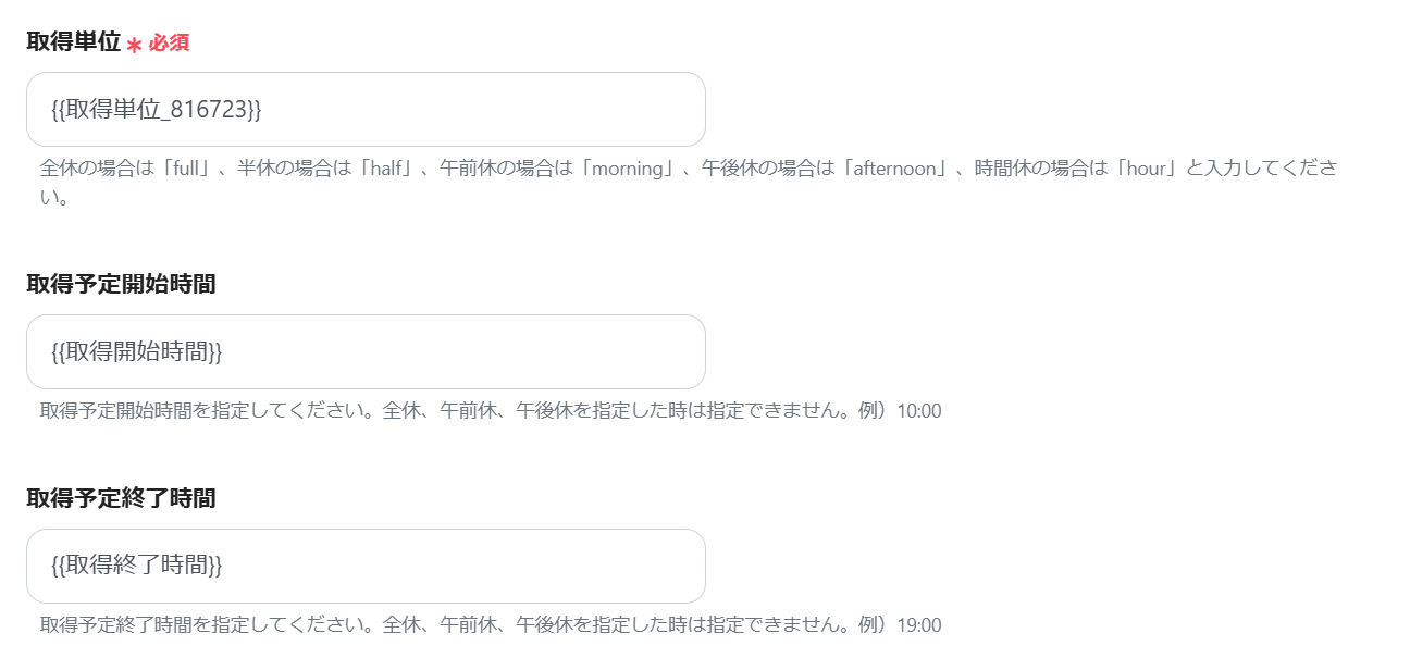 ※全休・午前休・午後休の場合→取得開始・終了時間は空欄