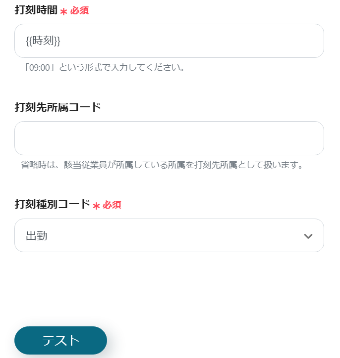 出勤時の打刻データの登録と同じように、「従業員識別キー」、「勤務日」、「打刻時間」を設定しましょう。