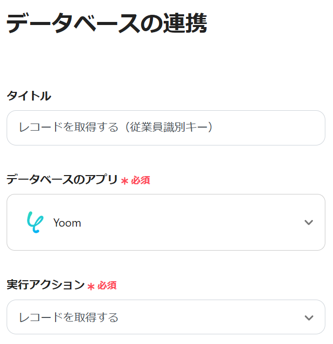 続いて、Yoomの指定したテーブルから条件に合うレコードを1行取得する設定を行うため、「レコードを取得する(従業員識別キー)」をクリックしてください。