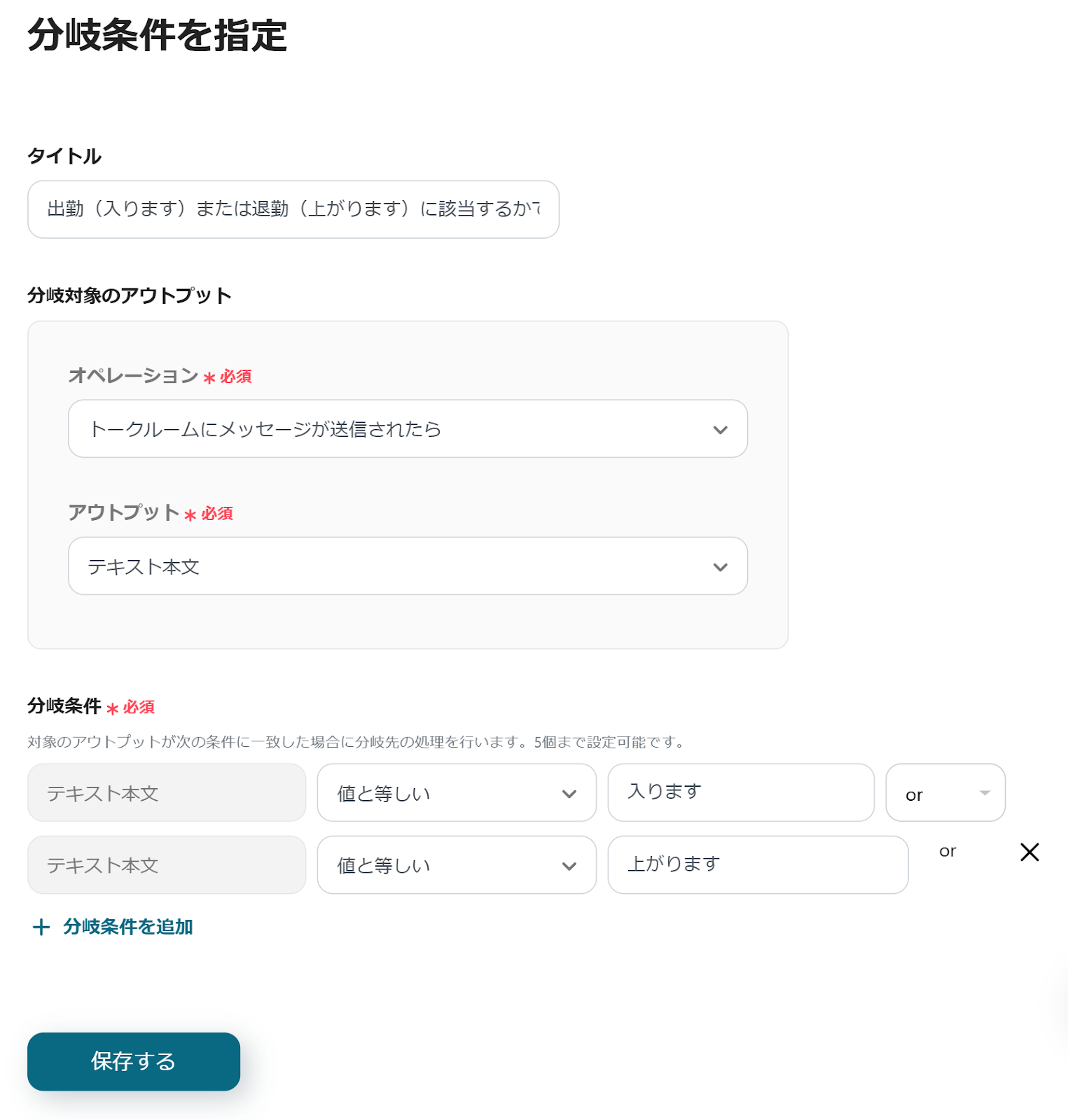 続いて、「入ります」、「上がります」という言葉で分岐する設定を行うため、「出勤(入ります) | 退勤(上がります)」をクリックしましょう。