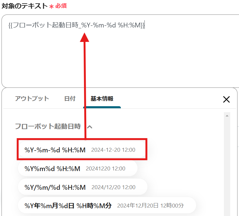 「基本情報」→「フローボット起動日時」→「%Y-%m-%d %H:%M」の順でクリックします。
