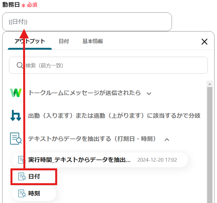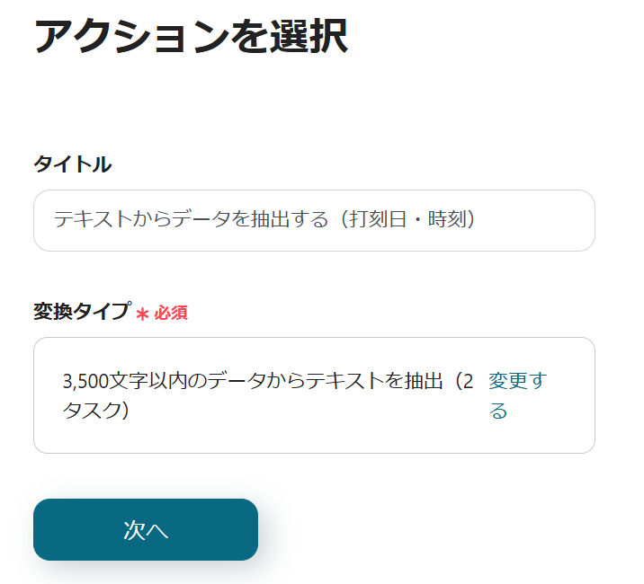 続いて、LINE WORKSのテキストから打刻日時を抽出する設定を行うため、「テキストからデータを抽出する(打刻日・時刻)」をクリックしてください。