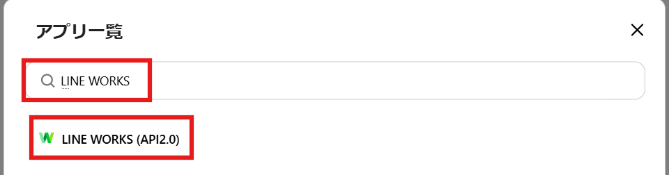 以下の画面が表示されたら、アプリ一覧からLINE WORKS(API2.0)を探すか、検索欄で検索してください。