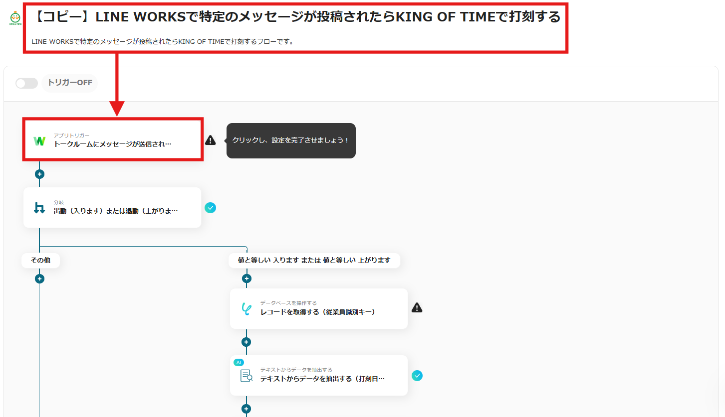 1.KING OF TIMEで前日の打刻漏れを検知し、自動的にLINE WORKSに通知するフローです。