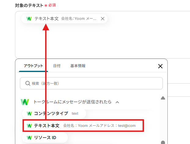 3.「対象のテキスト」に、先ほど取得したアウトプットから「テキスト本文」を選択します。