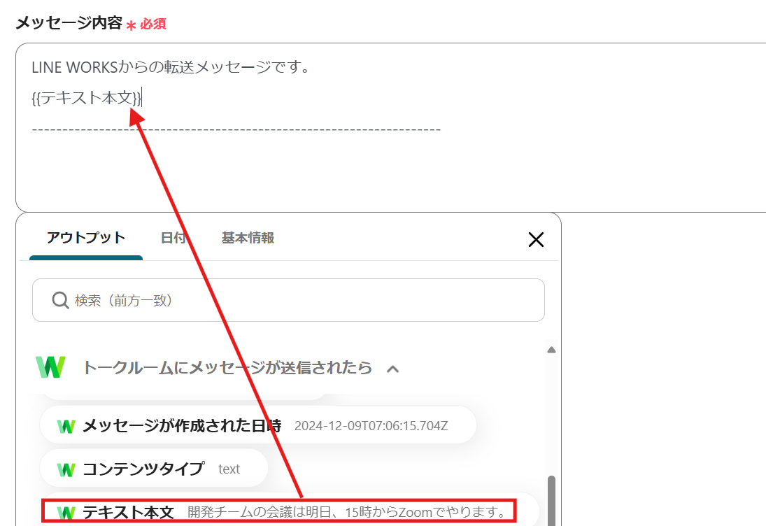 メッセージ内容は、以下のようにアウトプットを利用します。