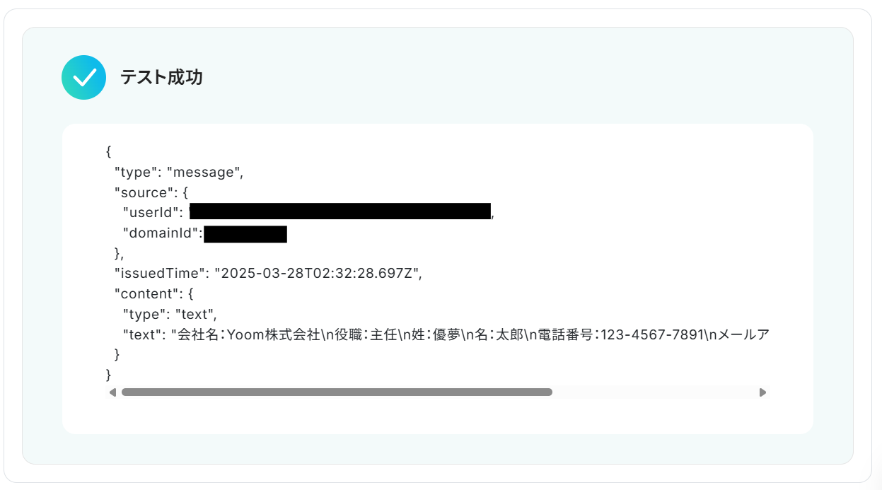 テストが成功するとLINE WORKSの値が表示されます。