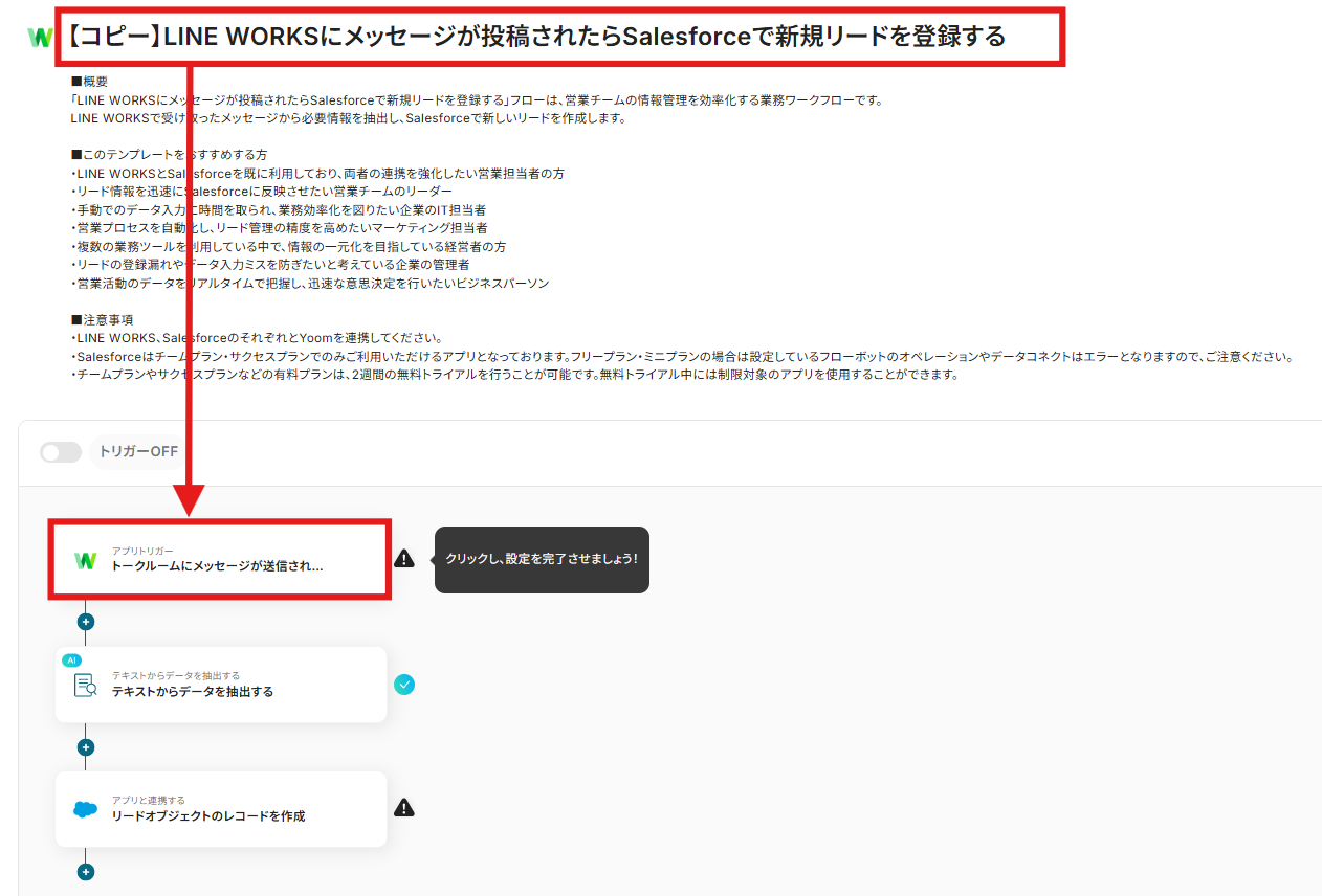 「LINE WORKSにメッセージが投稿されたら、Salesforceで新しいリードを自動で登録する」という便利なフローを中心に、