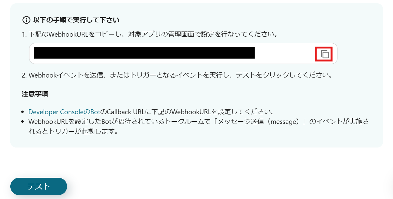 以下の画面が表示されたら、赤枠内をクリックしてWebhook URLをコピーします。