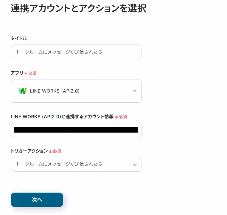 連携アカウントとアクションを選択する画面が表示されるので、今回連携するLINE WORKSのアカウントを確認し「次へ」をクリックします。