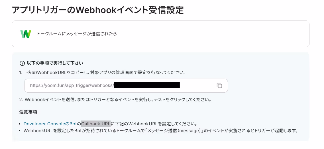 Webhookの設定画面が表示されるので、LINE WORKSのDeveloper ConsoleのBotのCallback URLに設定を行いましょう。